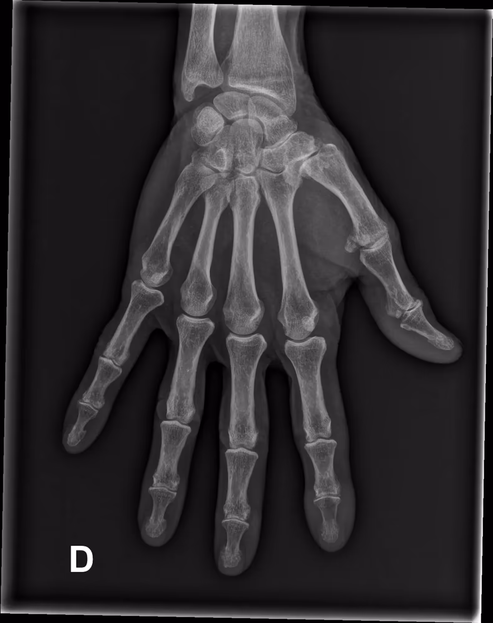 BoneView detected a lesion of the first phalanx, revealing infectious osteitis.