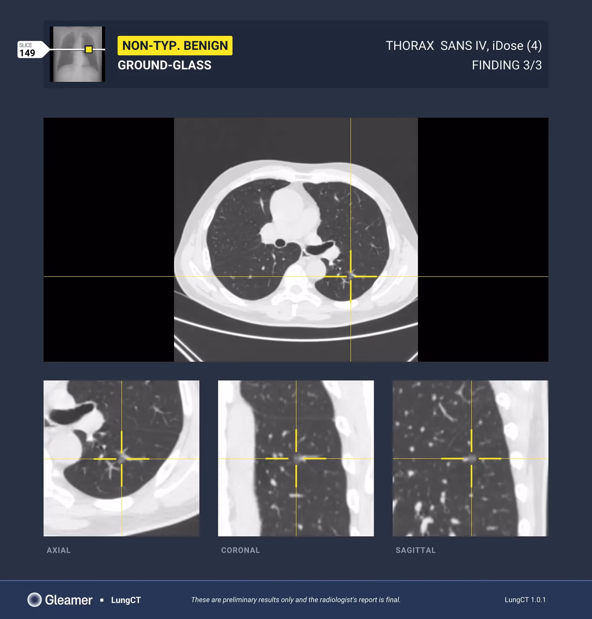 Pins each detection on the scout view and shows the exact slice number for fast navigation.