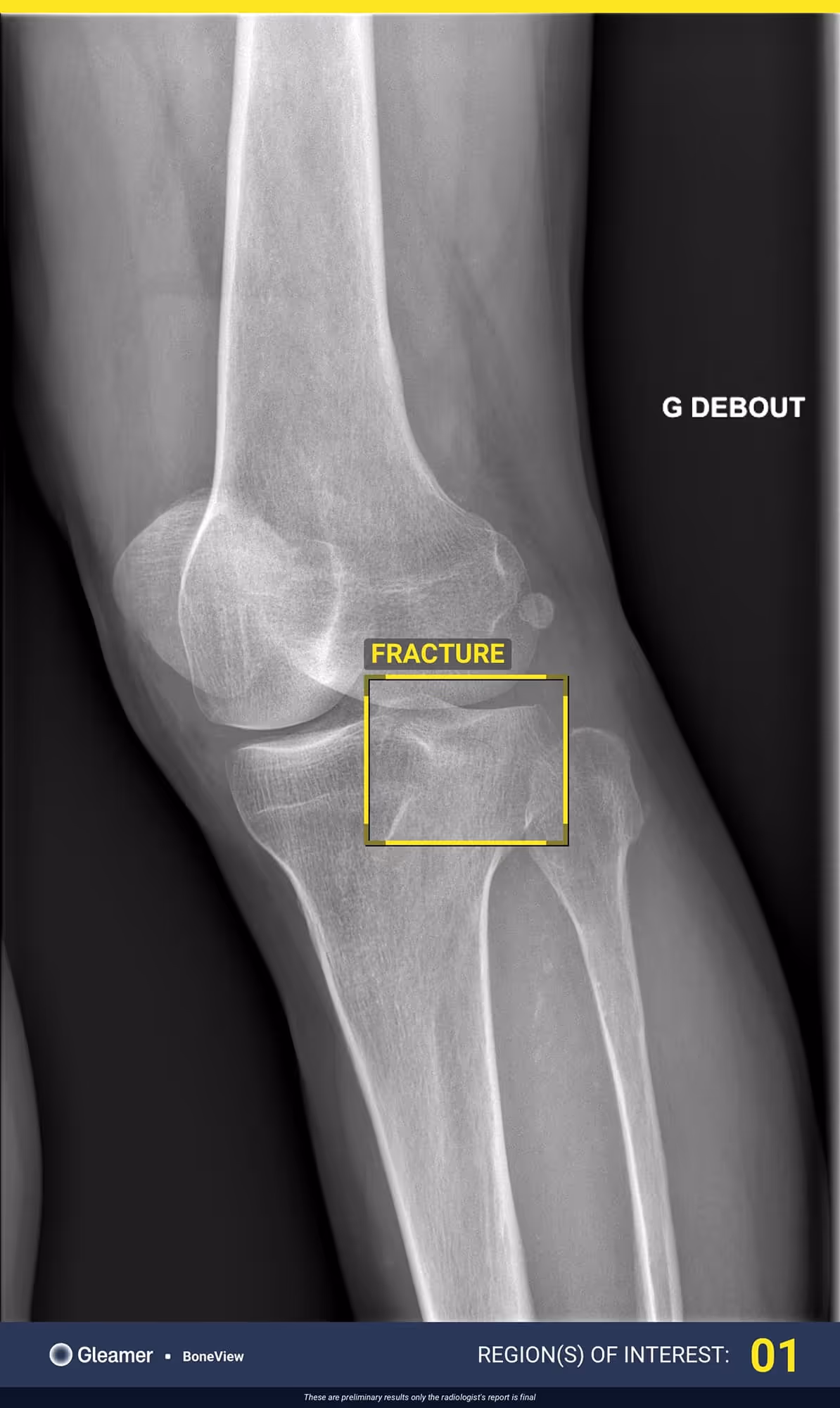 BoneView detected a fracture of the lateral tibial plateau and associated effusion. The fracture has a high risk of displacement.