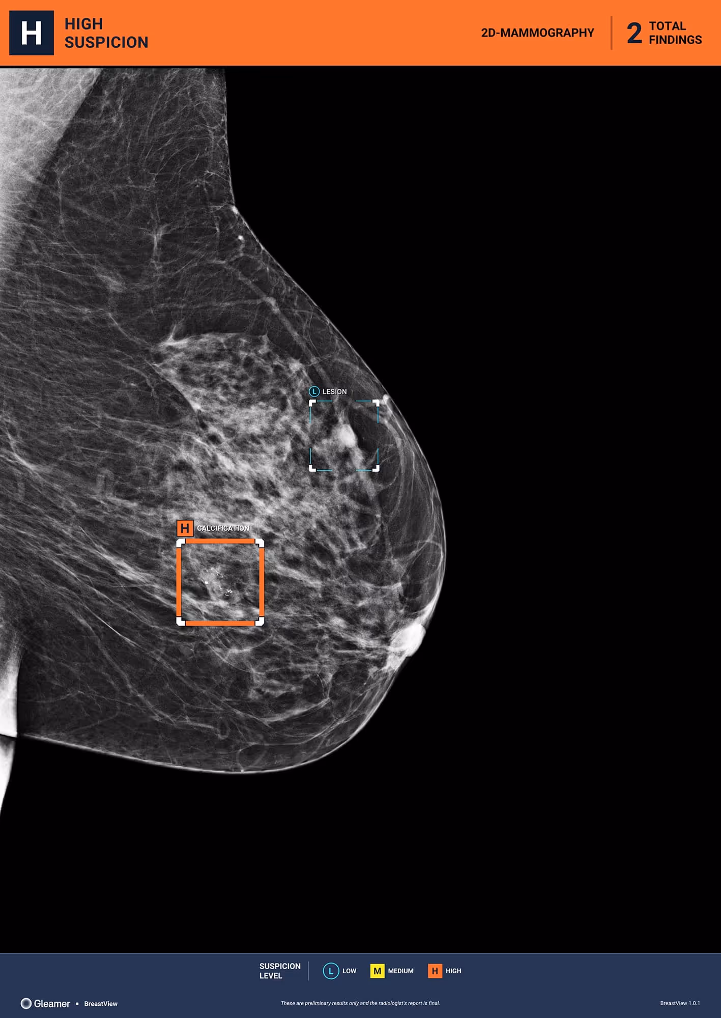 BreastView is an AI solution that analyzes mammograms to assist radiologists by highlighting suspicious breast lesions within their routine workflow. It detects soft‑tissue findings such as masses, distortions, and asymmetries, as well as breast microcalcifications, and provides both a malignancy score and breast density assessment.