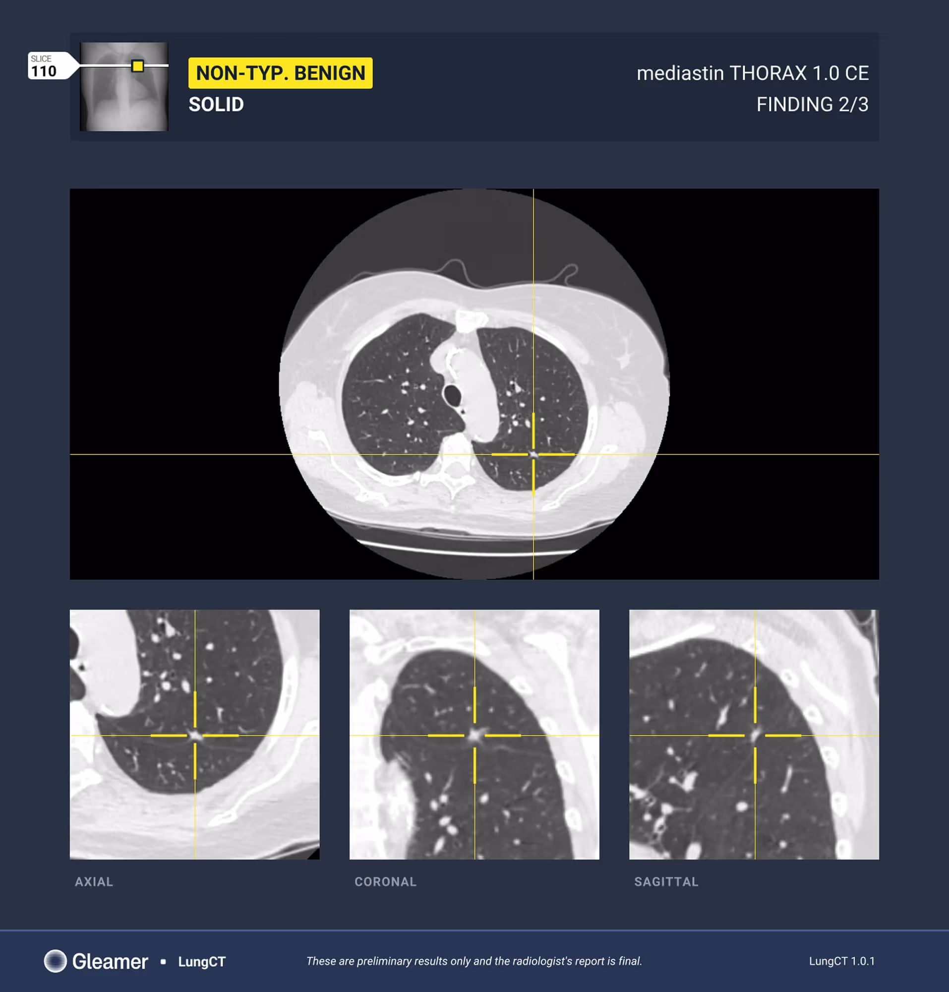 LungCT focuses on detecting pulmonary nodules, a critical element in lung cancer screening and diagnosis, by analyzing chest CT scans. It highlights suspicious nodules and provides structured characterization to support clinical decision-making, follow-up assessment, and early cancer detection.
