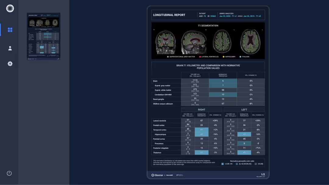 Pixyl.Neuro BV gives radiologists an AI-powered second reader for brain MRI. It automatically segments brain structures on 3D T1-weighted gradient echo sequences, computes volumes and compares results to normative references, highlighting any abnormalities through a clear structured report right in your workflow.